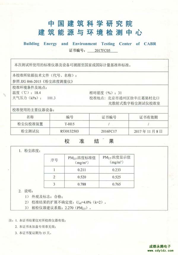 成都永騰電子PM2.5檢測儀檢驗報告